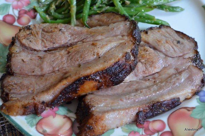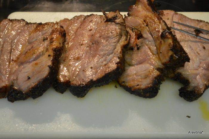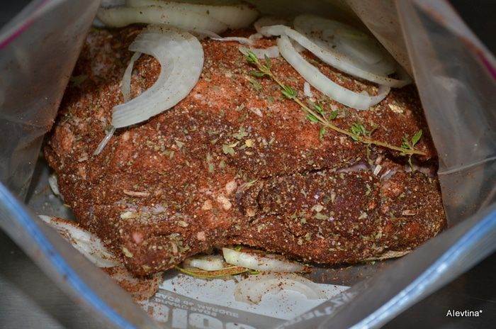 Смешаем заранее в пакете все перечисленные ингредиенты кроме свинины. Положим в пакет кусок свинины (лопаточно-шейный отруб) и дадим полностью покрыть его специями.