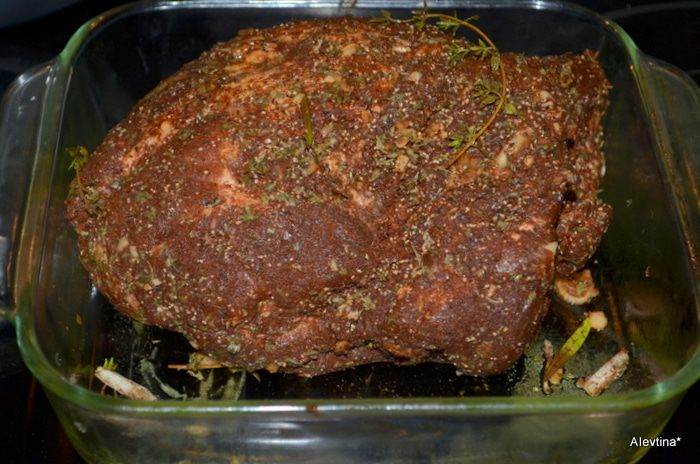 Достанем из холодильника. Дадим постоять при комнатной температуре 1 час. Поставим в разогретую духовку на 180 гр., в жаропрочном блюде. Выпекаем 2 часа. За 30 минут до готовки, можно прикрыть фольгой.