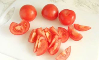 Помидоры помыть, нарезать ломтиками (клиньями).