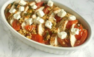 Куриное филе нарезать на кусочки и уложить на кускус. Сверху посыпать кусочками феты.