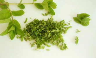 Оборвать листья мяты, помыть, обсушить и мелко нарезать. Йогурт смешать со щепоткой сахара и соли и половиной нарезанной мятой.