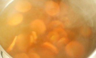 Вскипятить в небольшой кастрюле 350 мл бульона, добавить в него морковь и варить её 2-3 мин. Снять с огня, вмешать в бульон кускус, добавить сливочное масло и палочку корицы, перемешать, накрыть крышкой и оставить набухать в течении 10 мин.