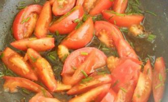 В сковороду всыпать тмин, кориандр и перец чили, обжарить в масле примерно пару минут, затем добавить томаты и лук. Обжарить недолго до появления сока. (Зелёного лука у меня не оказалось, вместо него пришлось добавлять лук-резанец (шнит), да и того было маловато).