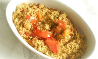 Помидоры с луком и кускус переложить в форму для запекания, добавить 200 мл овощного бульона. -