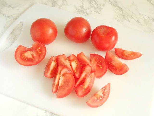 Помидоры помыть, нарезать ломтиками (клиньями).