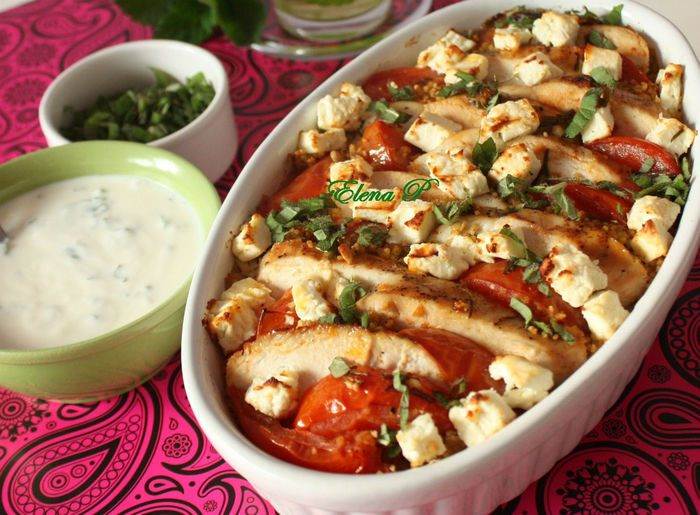 Форму вынуть из духовки и подавать на стол с мятным йогуртом и оставшейся мятой.