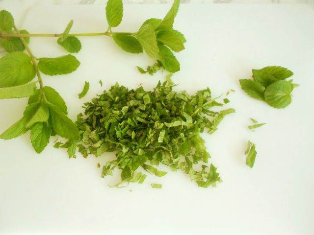 Оборвать листья мяты, помыть, обсушить и мелко нарезать. Йогурт смешать со щепоткой сахара и соли и половиной нарезанной мятой.
