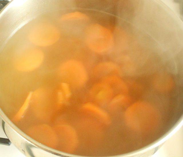 Морковь и зелёный лук очистить, вымыть и нарезать кусочками. Морковь лучше нарезать соломкой, тогда не надо будет разминать вилкой при добавлении кускуса.