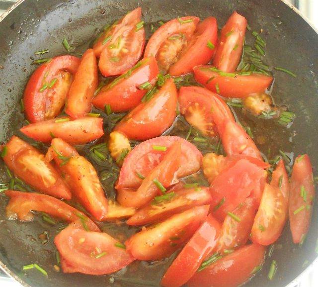 В сковороду всыпать тмин, кориандр и перец чили, обжарить в масле примерно пару минут, затем добавить томаты и лук. Обжарить недолго до появления сока. (Зелёного лука у меня не оказалось, вместо него пришлось добавлять лук-резанец (шнит), да и того было маловато).