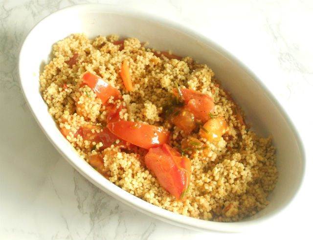 Кускус разрыхлить вилкой и добавить 1 ст. л. оливкового масла.