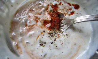 Далее необходимо будет нарезать каперсы, добавить йогурт, посолить, поперчить по вкусу, приправить паприкой и тщательно перемешать.