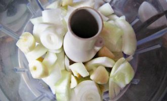 Измельчить лук и чеснок.