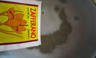 Залить пасту водой, довести до кипения, добавить соль, шафран и готовить по времени, указанному на упаковке (11 мин).