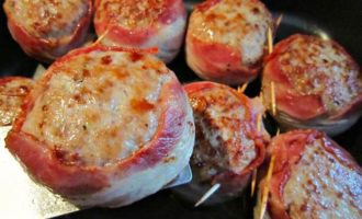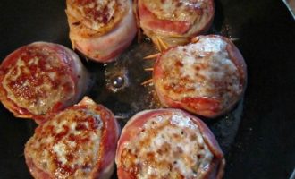 Обернуть полосками бекона котлетки и закрепить деревянными шпажками.