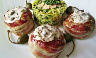 На тарелку выложить пасту рисони и медальоны, политые соусом. Можно подавать к столу!