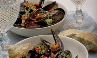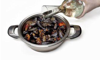 • Затем положить мидии, влить вино, посолить, поперчить и закрыть крышкой. Готовить еще 10 минут. За минуту до окончания готовки добавить мелко порубленную петрушку.