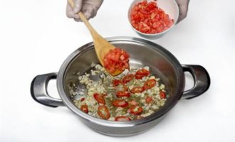 • Помидоры полминуты бланшировать в кипящей воде, затем снять кожицу, мелко порезать, добавить к луку, чесноку и перцу чили. Тушить 10 минут.