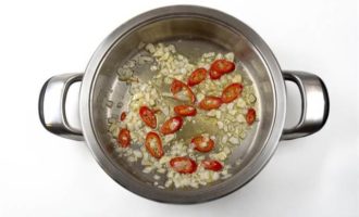 • Лук, чеснок и перец чили обжарить на оливковом масле.