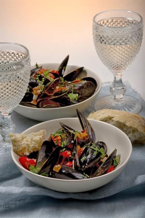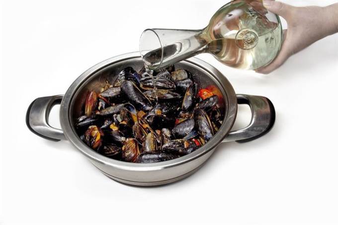 • Затем положить мидии, влить вино, посолить, поперчить и закрыть крышкой. Готовить еще 10 минут. За минуту до окончания готовки добавить мелко порубленную петрушку.
