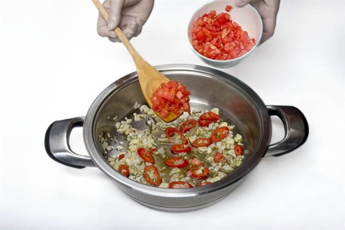 • Помидоры полминуты бланшировать в кипящей воде, затем снять кожицу, мелко порезать, добавить к луку, чесноку и перцу чили. Тушить 10 минут.