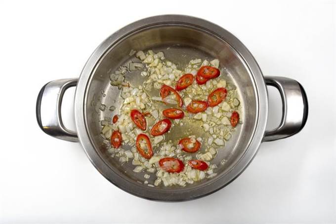 • Лук, чеснок и перец чили обжарить на оливковом масле.