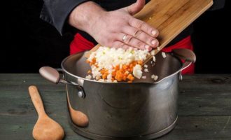 В тяжелой кастрюле разогреть 2 ст. ложки оливкового масла, выложить все овощи и обжаривать 5 — 7 минут, пока они не станут мягкими.