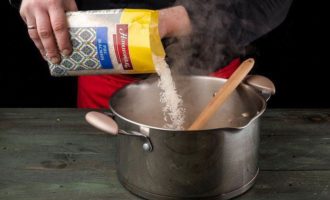 Рис Жасмин ТМ «Националь» добавить в кастрюлю к овощам, перемешать, залить горячей водой или бульоном и варить 10 — 12 минут.