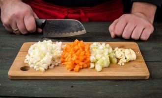 Лук, морковь, сельдерей и чеснок почистить и мелко нарезать.