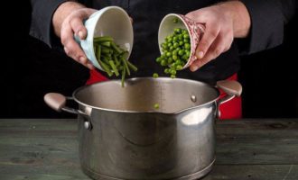 Добавить фасоль и горошек и варить еще 3 — 4 минуты до готовности риса и овощей, затем посолить и поперчить. Если суп получается слишком густым, влить еще немного горячей воды или бульона.