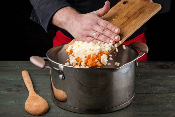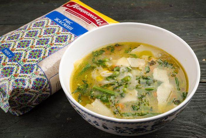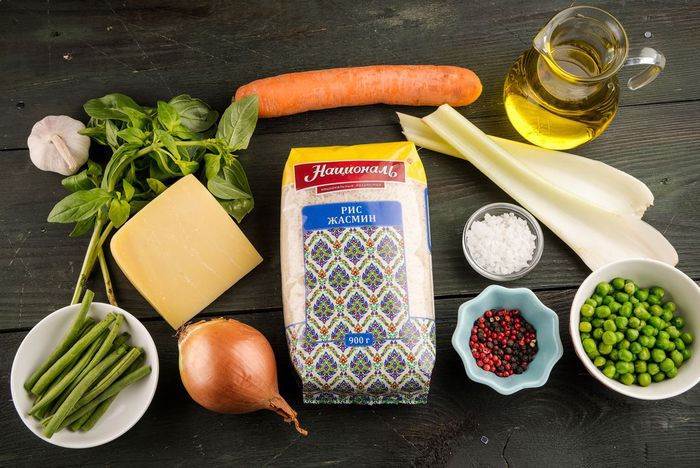 Рис Жасмин ТМ «Националь» добавить в кастрюлю к овощам, перемешать, залить горячей водой или бульоном и варить 10 — 12 минут.