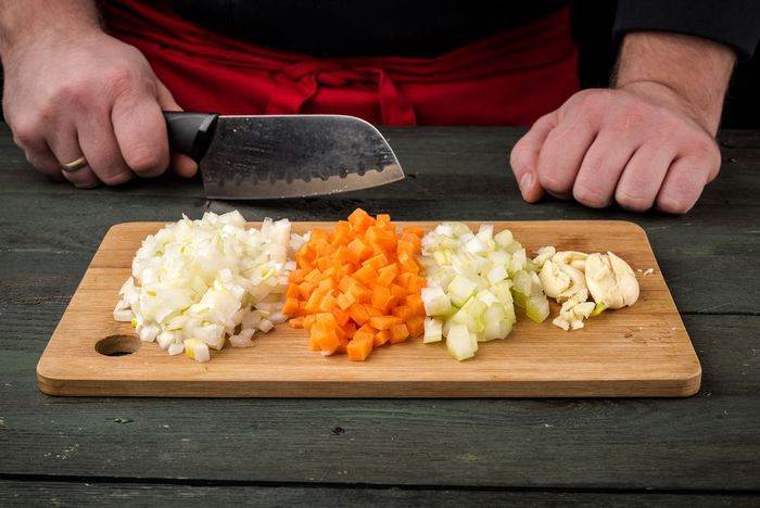 Лук, морковь, сельдерей и чеснок почистить и мелко нарезать.