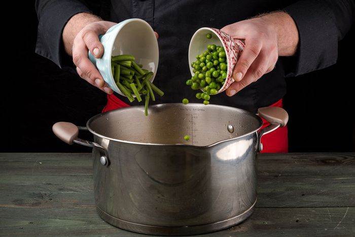 Добавить фасоль и горошек и варить еще 3 — 4 минуты до готовности риса и овощей, затем посолить и поперчить. Если суп получается слишком густым, влить еще немного горячей воды или бульона.