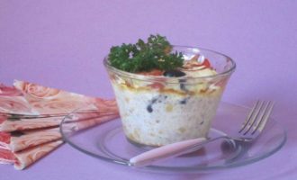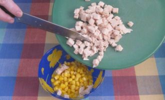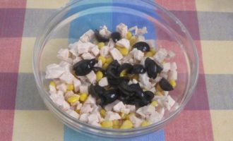 Добавить кукурузу без жидкости, нарезанные маслины. Посолить, поперчить.