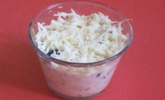 Залить формочки с куриным мясом, кукурузой и маслинами. Разложить нарезанные помидорки черри. Посыпать натертым сыром.