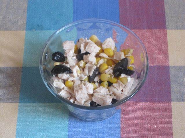 Добавить кукурузу без жидкости, нарезанные маслины. Посолить, поперчить.