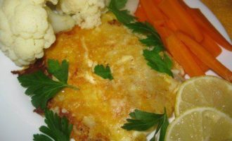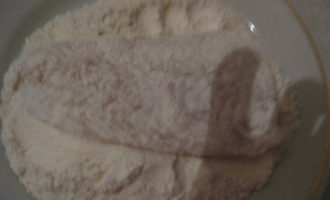 Рыбу обвалять в муке, потом в яично-сырной смеси.