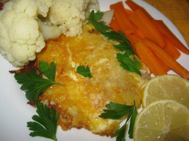 Рыбу обвалять в муке, потом в яично-сырной смеси.