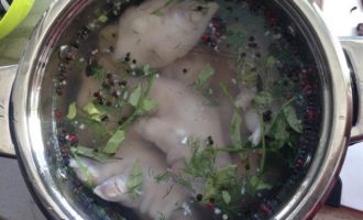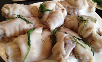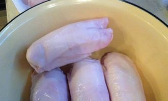Разрезать на 2 части и положить в холодную воду на 2 дня, чтобы вышла вся кровь и ножки избавились от специфического запаха. Воду периодически менять (я их держала в холодильнике и раз в 3-4 часа меняла воду).