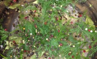 Готовим маринад. Разводим в воде соль, сминаем половину чесночных зубчиков боковой частью ножа, а остальные зубчики измельчаем чеснодавкой, листы лаврушки тоже ломаем на 2-3 части, добавляем остальные ингредиенты и всё хорошо перемешиваем.