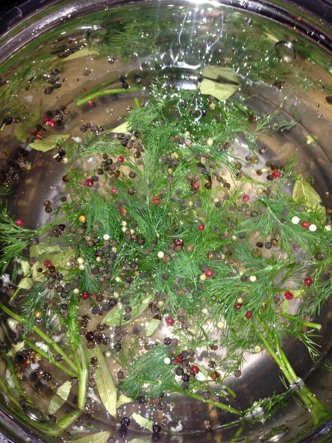 Готовим маринад. Разводим в воде соль, сминаем половину чесночных зубчиков боковой частью ножа, а остальные зубчики измельчаем чеснодавкой, листы лаврушки тоже ломаем на 2-3 части, добавляем остальные ингредиенты и всё хорошо перемешиваем.
