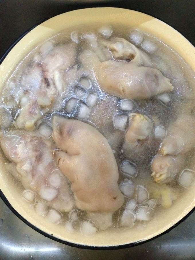 Пока ножки варятся, готовим рассол. Смешиваем холодную воду с солью и перемешиваем до полного растворения соли. Это нужно для того, чтобы весь лишний жир с ножек всплыл на поверхность воды. Готовые ножки вынимаем из кастрюли и сразу перекладываем в рассол минут на 5-10. Затем ножки промываем под теплой водой.