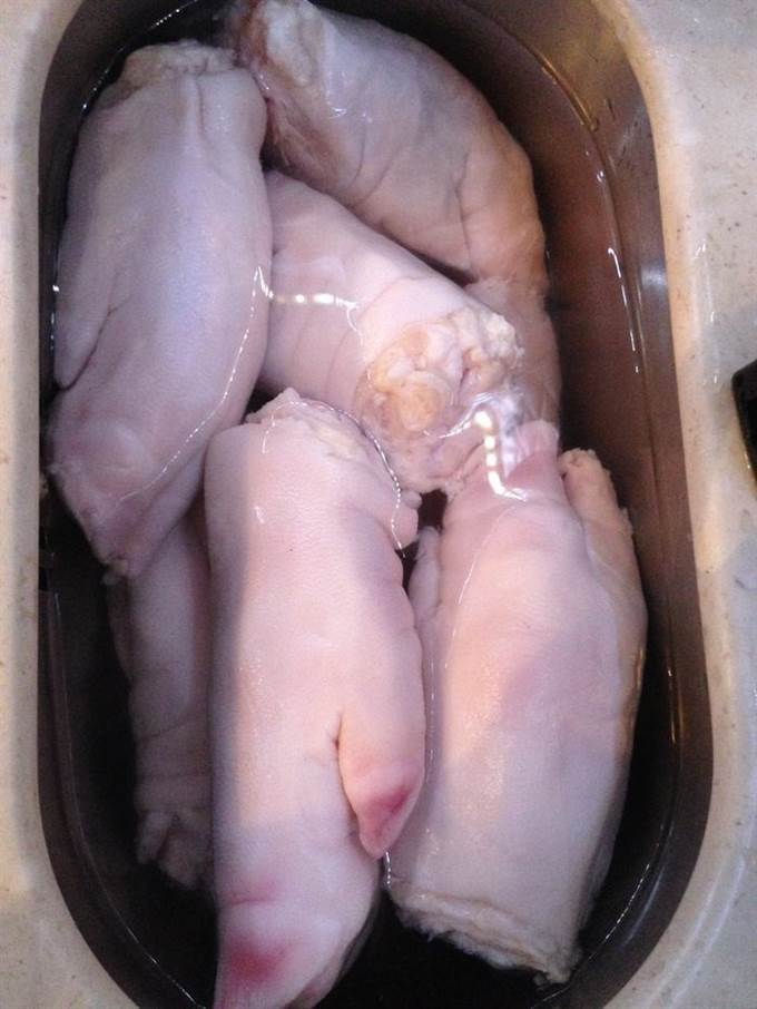 Разрезать на 2 части и положить в холодную воду на 2 дня, чтобы вышла вся кровь и ножки избавились от специфического запаха. Воду периодически менять (я их держала в холодильнике и раз в 3-4 часа меняла воду).
