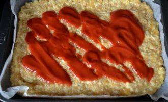 Сверху смазать томатным соусом (пассата). Или порезать 250 г помидорок черри и выложить по поверхности. Поставить в разогретую духовку выпекаться на 15 минут.