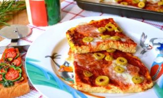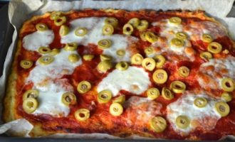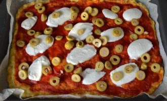 Через 15 минут достать противень и выложить на «пиццу» нарезанные предварительно сыр моцарелла и зеленые оливки.