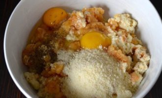Подготовить фарш. Хлеб порезать (порвать) на кусочки и замочить молоком. как следует размять и добавить в фарш. Перемешать. Положить в миску с фаршем яйца, тертый сыр пармезан и орегано. -