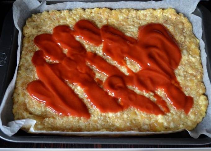 Сверху смазать томатным соусом (пассата). Или порезать 250 г помидорок черри и выложить по поверхности. Поставить в разогретую духовку выпекаться на 15 минут.