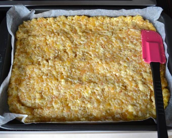 Прямоугольный противень (примерно 24х33) выложить пекарской бумагой и распределить фарш ровным слоем.