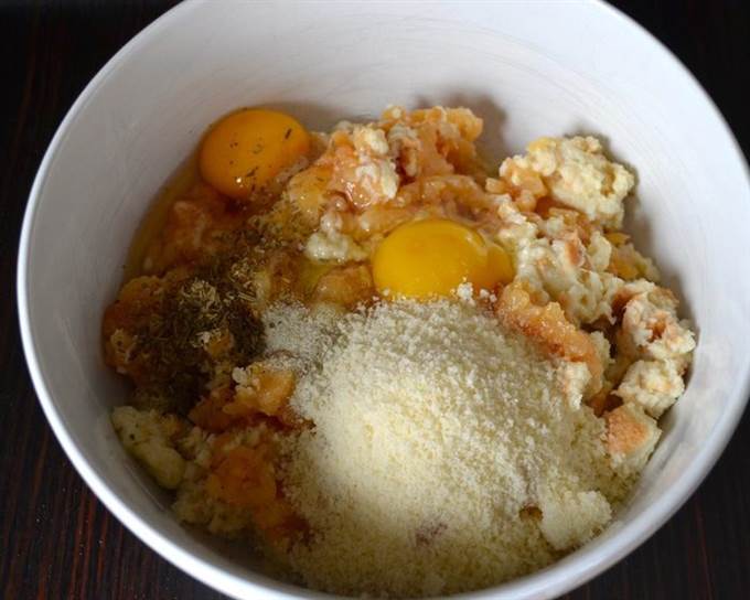 Подготовить фарш. Хлеб порезать (порвать) на кусочки и замочить молоком. как следует размять и добавить в фарш. Перемешать. Положить в миску с фаршем яйца, тертый сыр пармезан и орегано. -