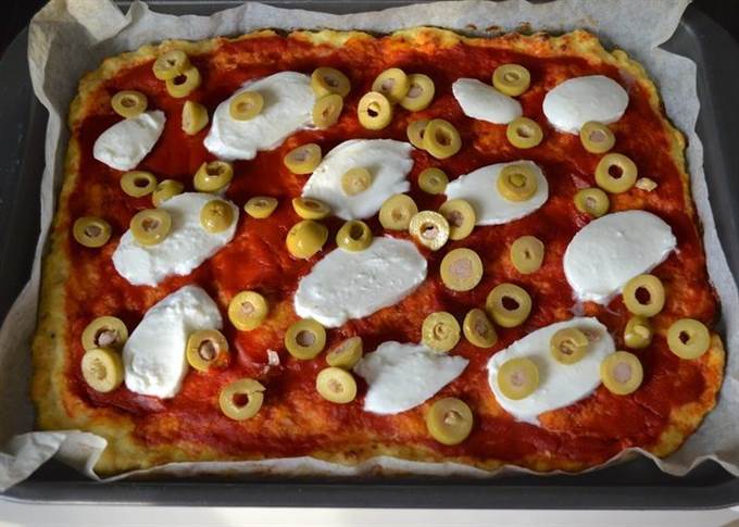 Через 15 минут достать противень и выложить на «пиццу» нарезанные предварительно сыр моцарелла и зеленые оливки.