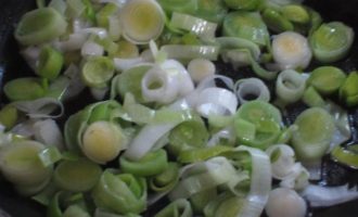 Лук-порей мелко нарезать и обжарить 2-3 минуты в 4 ст.л. оливкового масла. Влить нeмного тёплой воды, посолить, накрыть крышкой и тушить 10 минут. Остудить.